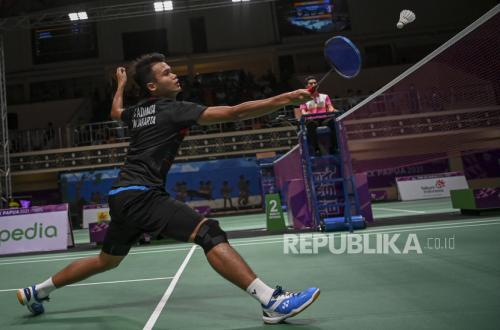 REPUBLIKA.CO.ID,JAYAPURA -- Pebulu tangkis Putra DKI Jakarta Christian Adinata berusaha mengembalikan kok ke arah pebulu tangkis putra Jawa Timur Gatjra Piliang Fiqilillahi pada pertandingan semi final beregu putra PON Papua di GOR Waringin Kotaraja, Kota Jayapura, Papua, Jumat (8/10/2021).